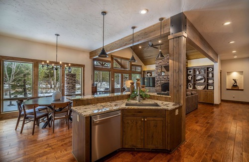 This custom, hideaway vacation rental offers single level living with 3.5 baths, 3 master suites (3 king), a den (queen tempurpedic sleeper sofa) AND an upstairs bonus/bed room (4 twin beds). The den, just off the great room, is lined with knotty alder wainscoting, hardwood floors and knotty alder barn doors for privacy. Each bedroom is equipped with a flat screen TV, there is an XBOX gaming system, games/cards, and wireless internet throughout.