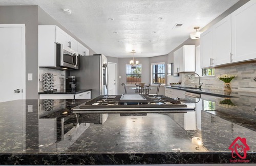 The gourmet kitchen is a home cook's dream, fully equipped with deluxe stainless appliances and spacious stone countertops, offering ample food prep zones. Just bring your ingredients and start cooking!