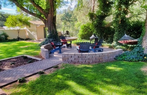 The Orchard House on Sedona Oak Creek- See and hear the pleasant calming sounds of Oak Creek & wind in the trees from an Eden-like private canyon back yard with ivy & wild roses grown along the back fence. This place is so peaceful. Canyon walls surround you, as Oak Creek runs year round. Retreat to this charming 4 bedroom, 2 bath canyon cabin with a deck overlooking the creek. It also has a separate room over the garage that can be used as a 5th bedroom but has to be accessed from the outside. This house is referred to as The Orchard House, due to the several varieties of apple, pears, peach and cherry trees, with grape vines along southern fence line. Also, let's not forget the two almond trees in the front....everything grows here!