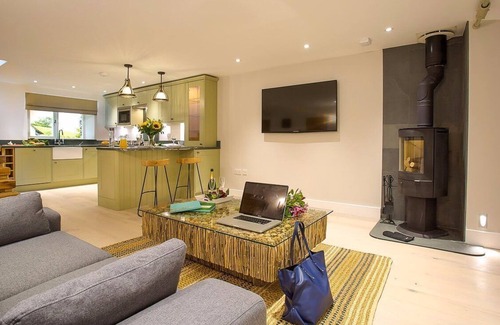 On the ground floor, there's the open-plan kitchen and living area. The bespoke kitchen has everything you'll need to self-cater with ease, including a double oven, induction hob, fridge/freezer and dishwasher, pots and pans, plus a peninsula with stools where you can enjoy a quick bite.