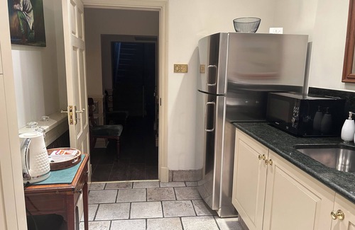 Large kitchenette with fridge/freezer/microwave/ air fryer/ crockery/cutlery/glassware all provided. Separate utility room with washing machine and separate dryer/iron/ironing board etc.