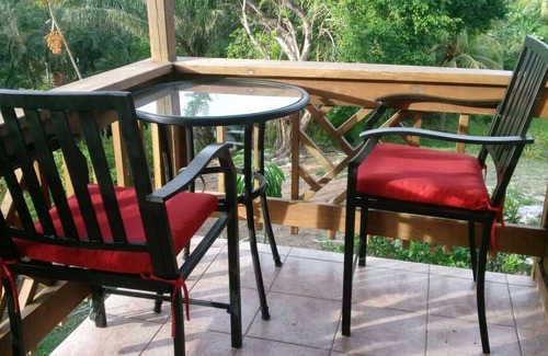 Very quiet and private on a half acre of lush Roatan landscape complete with Banana, Guava, Papaya, Coconut, Cashew and Mango trees located in Sandy Bay. It is very PEACEFUL and conveniently located. It has a queen size bed, full kitchen, bathroom, full air conditioning, its own balcony with BBQ, cable TV, WiFi, games, music, and it shares the washer, dryer, swimming pool and dock with the main house. Freshly remodeled with all new windows, new dresser, new a/c unit, outdoor table and paint.