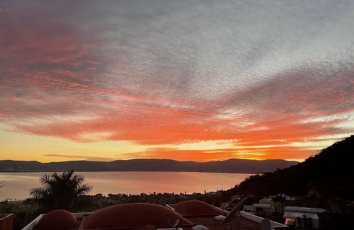 Nestled in the exclusive Raquet Club with a knockout view of Lake Chapala and the mountains and stars above you will find our beautiful home. There are two individual units inside our stone walls and we have an extensive array of flowers and trees .. Hummingbirds , Orioles,, Red and Blue birds are daily visitors as well as many butterflies. and an occasional pair of cows walk up the road to graze on the neighbor’s grass!