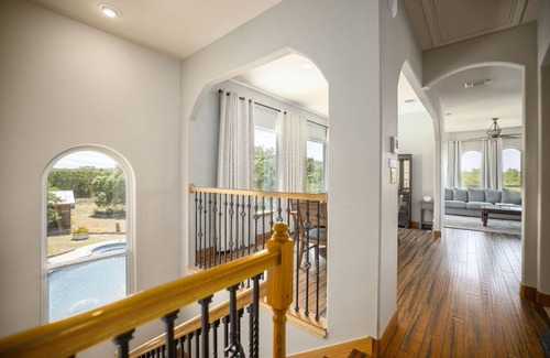 The entrance of the home features a cozy entertaining area that features two comfortable sofas, a Smart TV, a card table, and direct access to one of the home's best features: the pool! Head through the short hallway and out the backdoor where you'll find yourself on the deck that overlooks a beautiful resort-like pool. To the left of the pool, you'll find a pavilion that houses a large grill and plenty of seating making it the perfect spot to end a perfect day in the Texas Hill Country.