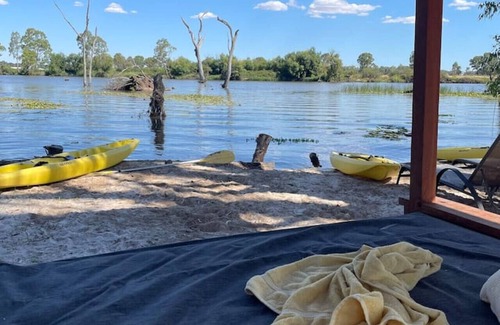 An original design, timber lined hut features all the amenity you need to level up on a camping experience. Indoors you'll fine a private ensuite, mini-fridge, comfy king bed with river views and clear roof for stargazing. Outside, a mini webber bbq and alfresco dining are on the deck while two , sun lounges are set in your private garden on banks of the Goulburn River.