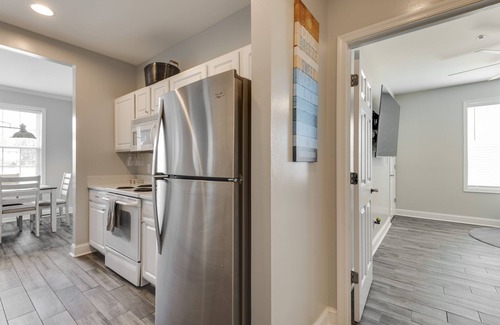 The kitchen includes brand new bright quartz countertops, new sink and garbage disposal, dishware for eight, and all cookware in case you and your party want to dine in. Also included is a K-cup maker which can make a single cup or full pot. We supply a wide choice of coffee for your stay.