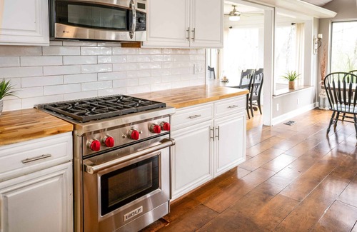 The fully equipped kitchen is a chef’s delight, showcasing stainless steel appliances, butcher block countertops, and sleek white cabinetry stocked with cookware and dining ware. Two dining tables can accommodate formal meals or spontaneous game nights alike, each seating 8 and 6, respectively.