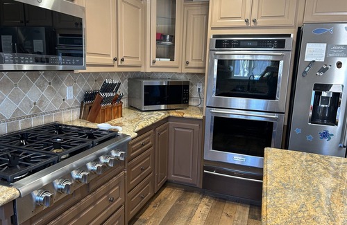Large vacation home located at the top of a private drive with beautiful view of the hills. Fully stocked kitchen with everything needed for a family holiday gathering - 2 ovens, 2 microwaves, warming drawer, spare fridg/freezer in garage. Large TV in each bedroom and in living rooms. Balcony attached to upstairs bedrooms with patio furniture and heater; dining and seating areas on back patio with fire table, heaters, and hot tub. Gas and pellet BBQs, hibachi/teppanyaki grill.