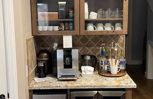 Main home and separate Adult Dwelling Unit located at the top of a private drive (15 feet apart) with a beautiful view of the hills. Total of 7 bedrooms and 6 bathrooms (5/4 in main house, 2/2 in ADU), 2 queen sofa beds and queen Murphy bed in main house, 1 queen sofa bed in ADU, 2 garages. Two fully stocked kitchens with cooking and serving-ware, large variety of drink glasses, fully automatic espresso makers, cooking essentials provided. Large screen TV in each bedroom and in living rooms. Electric room darkening shades, ceiling fans/light fixtures with remotes, Amazon Echo and wireless chargers in each bedroom. Outdoor dining/entertainment areas with seating, patio heaters, dining tables, and fire tables located in rear of main house and in front of ADU overlooking hillside, 2 hot tubs, gas and pellet BBQs at both houses, and hibachi grill at main house. Laundry rooms and EV car chargers at each house. Locked storerooms in each house are not for guest access. Pets only allowed in ADU unit.
