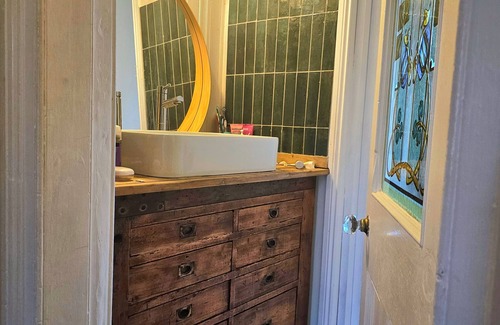 It has a beautiful, recently renovated bathroom with a huge bath, a great big living room with comfy couches, a projector and projector screen for nights chilling out watching films and, black out curtains in every room, a large kitchen and dining table space.