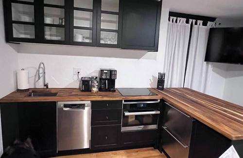 The second unit is on the second floor and to the right of the home. It features black and white accents and newly remodeled space. Step into a living room and well equipped kitchen space with high end appliances. The bathroom features a classic black and white mosaic floor and subway tile with duel rainfall and adjustable shower heads. It also features a grohe smart control. A stacked LG ThinQ washer/dryer finishes the space.