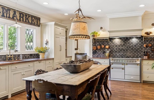 Step inside and you’ll find spaces that are both refined and welcoming, layered with antiques, original artwork, and vintage rugs that tell a story in every room. Chandeliers sparkle above inviting seating areas, where plush velvet and leather chairs, heirloom tables, and curated oil paintings create a sense of timeless elegance. The kitchen is a chef’s delight, blending historic character with modern functionality - copper countertops, a professional AGA range, and a wall of apothecary drawers set the stage for memorable meals shared around the vintage farmhouse table.