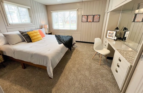 You will love small house living with this mid century modern vibe. An open plan kitchen, dining and living let you spread out to enjoy the incredible light. The house has two large bedrooms featuring king beds in both. The house is a block away from RRVT, a 72 m paved bike trail. Our lovely town offers a coffee shop, eating options and several parks within walking distance.