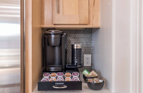 Kitchen: Fully stocked with stainless steel appliances, Quartz countertops, Keurig coffee maker (K-Cups supplied) and essential cooking supplies