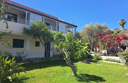 The neat property Marema is surrounded by olive groves and located above the fine sandy beach of Peroulia in a nice hillside location. The 3 holiday apartments are next to each other with a separate entrance each. The basement flats below the apartments are used by the landlord family. The estate Marema is surrounded by a beautiful enclosed garden property cultivated with banana plants, citrus trees and plenty of Mediterranean plants and flowers. The lawn in the front garden is for the shared use of all guests.