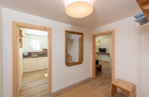 Inside, you will find amenities that will make your stay unforgettable. The kitchen, with a beautiful Swiss stone pine dining area, is fully equipped - including a fridge with freezer compartment, oven, dishwasher and a fully automatic coffee machine for whole beans. In the living room, a green sofa, a cosy reading chair and a TV invite you to relax. A cosy wooden floor harmoniously connects all the rooms, complemented by a bathroom with a walk-in rain shower that leaves nothing to be desired.