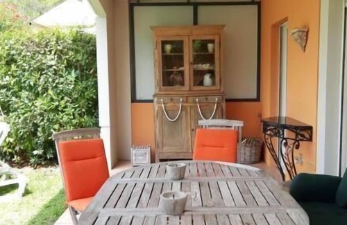Vacation where Picasso lived:The modern holiday flat with 81 m² living space (including 15 m² covered terrace) and 130 m² private garden (not "dog-proof" enclosed) is part of the wonderfully green residence Les Bastides du Golf. Both the tennis court and the large, very well-maintained swimming pool with comfortable sunbeds, parasols and showers are only a few steps ( 500 m²) with comfortable equipment: sunbeds, parasols, reading tables, fountain and separate shower house3) the tennis court surrounded by trees, which our guests can also use free of charge and without registration.Even in high summer, the communal areas are easily accessible and seldom heavily frequented, often even free for sole use. The pool and tennis court are protected by a fence suitable for children. The private area is surrounded by a hedge (but which can be bypassed by dogs).You can move around the 20,000 m² park-like area of the residence undisturbed and safely. There is no flowing car traffic. Residents and guests enter the holiday complex via an access code. Views of the opulent nature & foothills of the Southern French Maritime Alps open up everywhere from the complex. The residence is serviced all year round (concierge & gardening team on site). The private and secured parking space completes your perfect holiday ambience.