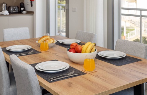 The spacious balcony has outdoor furniture, with an unobstructed view to Nazaré marina, Salgado beach and green fields stretching from Nazaré to the hills. The ideal space to relax after a day at the beach or to have meals outdoors!