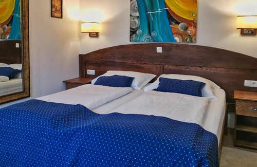 Luxury double room is decorated as a combination of modern and traditional. There is bed 1.8m wide, sitting area, working table and mini bar. Room has AC and heating. There are SAT tv, Wi-Fi and safe in the room. Room has a view on a garden where you can spend your free time and relax. Bathroom has shower and a bathtub, hair dryer and toiletries.