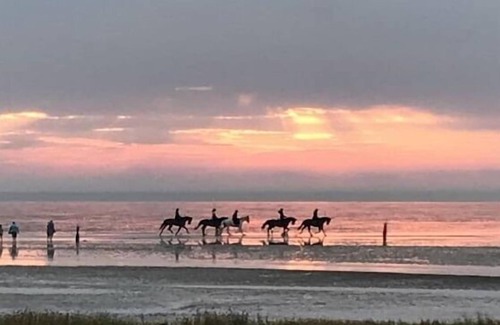 The holiday apartment has a 40sqm living-dining area, in which two large beds provide additional sleeping space. An additional child's bed and a travel bed are possible in the bedroom. All beds are made and towels are provided. You can access the large roof terrace from the bedroom. Here you can enjoy breakfast at sunrise and end the day at sunset. Feel free to bring your bikes, there is a garage and you can reach the beach areas in about 30 minutes. Cuxhaven offers the unique opportunity to walk through the mudflats to the island of Neuwerk. The island can also be reached by mudflat cart or boat.