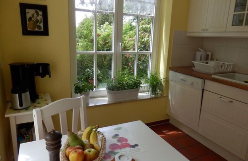 The apartment is located in a beautiful villa with a Mediterranean flair, surrounded by a natural garden park. Spacious living-dining area (terracotta tiles/underfloor heating) 2 bedrooms (1 x double bed, 1 x 2 single beds) 1 comfortable guest bed (only if required) Baby bed for children up to 4 years, high chair (Bed linen included) Shower bath (towels included) Hygiene products Excellently equipped kitchen, fresh herbs, spices, coffee machine + espresso maker, children's crockery. A sweet temptation - the homemade jams for breakfast. Cozy loggia with garden furniture, lawn/sun loungers. In town: mini market, butcher, known for game specialties, restaurant. Supermarket with drinks market 5 km away.