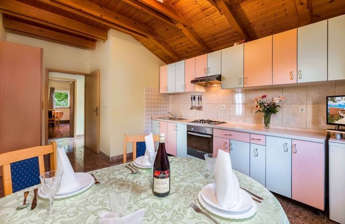 The holiday apartment is located in a standig individually detached house. The property is located on the outskirts. The domicile is also popular because of the view over the sea from the property and the sunny location. For common use are available: grill possibility.LocationMatulji, district Bregi. The holiday apartement is located on a 750 sqm, open plot with flowers, bushes and trees. The landlord lives permanently in the house, but uses a seperate entrance. Holiday apartment KVA OPA 354 (4 people) is located in the same house. The access goes via a path (asphalted). Parking lot on the property. Specialair conditioner. Facilities: internet access (WLAN). TV reception takes place via satellite. Dogsnot allowed. DistancesShopping opportunity 150 m, restaurant 150 m, town center 4 km. pharmacy, bank each 4 km in Matulji. thermal bath, indoor swimming pool each 7 km in Opatija.In summer: Adria 7 km in Opatija (beach 7 km in Opatija with stones, rocks and bathing plateaus). mini golf in Medveja 17 km. tennis, fishing, diving, boat rental, boat launch each 7 km in Opatija. horse riding in Učka 6 km. DivisionHoliday apartment, 1 floor, 3 rooms (including 2 bed rooms), 52 sqm, in total 4 beds. RoomThe entrance in your holiday apartment is located in the attic. Eat-in kitchen with TV and dining area. 2 bedrooms each with 1 double bed and access to the terrace (6 sqm, covered, garden furniture). Cooking nook in the eat-in kitchen with gas stove (3 flames), electric stove (1 plate), oven, extractor hood, fridge (icebox), microwave, coffee machine, toaster and electric kettle. Bathroom with shower, 1 sink, WC and window. Terms of lease and pricesIncluded in the priceinternet access, parking place, electricity, gas, water, final cleaning, Bed linen (weekly change), Wireless Internet access. Side costs-Additionally(Payable when booking)/local tax.Costs on the spot:/On request:air conditioning 5 € per object per day.Deposit:EUR 100,-/object
