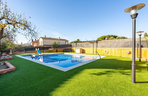 With mountain views, the holiday home Masia Can Divi, with step-free access in Ametlla del Vallès, impresses guests with its fantastic scenery. The 336 m² property consists of a living room, kitchen, 6 bedrooms, 5 bathrooms, and an additional toilet, accommodating up to 12 people. Additional amenities include high-speed Wi-Fi (suitable for video calls) with a dedicated workspace, TV, air conditioning, washing machine, and dryer. You will also find a ping-pong table for your enjoyment. The building has a lift. This holiday home offers a private outdoor area with a fenced pool, children's pool, garden, open terrace, balcony, barbecue, playground, and outdoor shower.