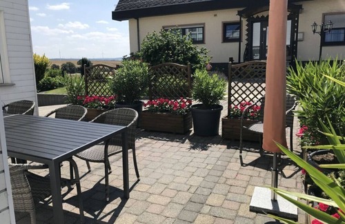 The Weins holiday home offers ideal accommodation for families, hikers, cyclists, motorcyclists or groups of up to 8 people. Whether it's a starting point for active tours or a place to relax, with us you will feel very comfortable in our 130 m² of living space. Up to 8 guests can enjoy the rural village scenery in 5 separate bedrooms. A kitchen with a seating area offers the opportunity for self-catering. In the directly connected winter garden you can enjoy the panoramic view over the Hunsrück heights. The separate living area with TV, stereo system and WiFi offers a place to retreat. The barbecue area located directly at the house is ideal for ending a beautiful day in comfort. 2 bathrooms with shower, toilet, towels,