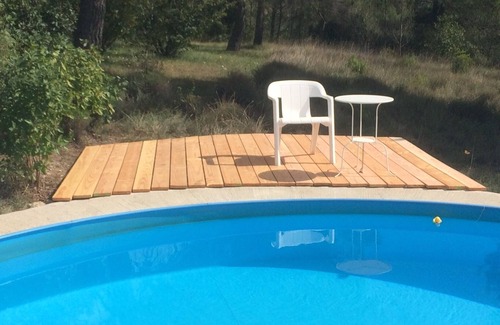 The holiday home "La Garrigue" stands on a huge plot of over 17,000 m² and is therefore ideally suited to allow children to develop freely - however open fire is strictly prohibited. Scattered in the landscape are some neighboring houses, far enough away to experience real silence. It is at least 80 m to the next house and 800 m to the country road. Built at the end of the 1970s, it is no longer very young and is nevertheless equipped with modern building technology. There are 2 bedrooms available, one with a separate sink. Both are equipped with double beds (separate mattresses). In the living room there is a pull-out sofa that can be used as a bed for 2 more people. All necessary cooking and household utensils as well as spices and cleaning agents are available.