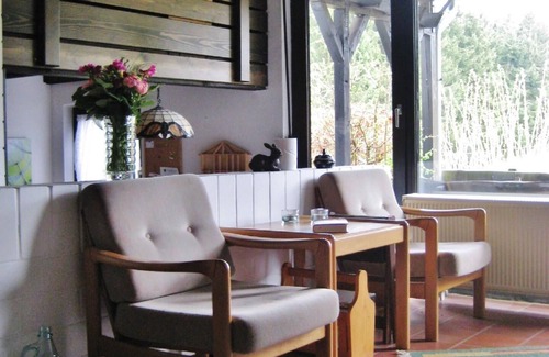 The living room flooded with daylight opens onto the generous roofed south-facing terrace, which provides pleasant shade at midday at the height of summer, whilst you can enjoy the sunshine in the mornings and evenings undisturbed. This terrace and the terrace in the sunny garden provide ample garden furniture with cushions and parasols. While children are playing on the 650m² natural site and exploring nature, maybe picking the many delicious wild strawberries, you can relax on the lounger I the shade of a tall oak tree. On clear nights you can discover a fabulous starry sky, as can no longer be found above cities with light pollution.