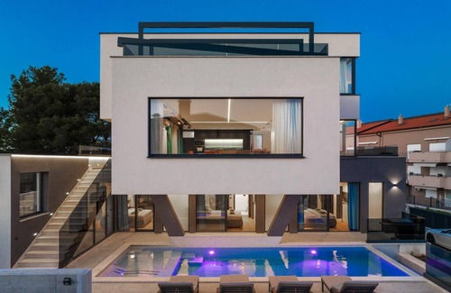 Luxury Villa Nerra with a private hydro-massage pool (30 m²), sauna, jacuzzi, and gym represents a modern designer villa. Located in Medulin, Istria, it is just 230 meters from the sea and the nearest beach. Medulin is a popular destination in Istria offering beautiful beaches, various activities for children, and a wide selection of restaurants with delicious delicacies.