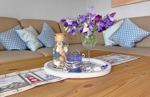 The 5 star holiday house beach house is decorated in subtle natural tones in a maritime style and offers up to 6 people plenty of space for well-being and accessibility. A spacious living / dining area with woodburning stove and open kitchen, 3 bedrooms (2x double bed, 2x single bed) and 2 shower rooms provide a pleasant holiday comfort. The beautiful landscape of the area can be enjoyed on the partly covered terrace. Here garden furniture for relaxing moments and a wide view over the fields and meadows. Of course, Wi-Fi is available free of charge and there are parking spaces in front of the house. In the cottage beach house are a maximum of 2 dogs welcome.
