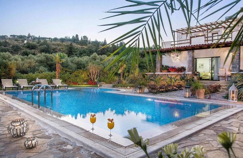 Holiday home built in 2014 with a large garden and private pool in the small village of Pemonia, at the foot of the White Mountains, with a wonderful view of the green landscape. The tastefully and comfortably furnished country house combines traditional architecture with modern style elements. On the 1,200 square meter garden plot with lush plants, covered terrace and barbecue area you can relax and refresh yourself in your own pool. Within a radius of 2 km you will find numerous rustic taverns with typical Cretan cuisine. The beautiful sandy beaches of Georgioupolis and Kalives are about 10 km away. The impressive Lake Kournas is also only 10 km away. The location between Chania and Rethymnon is ideal for exploring the Apokoronas, one of the greenest regions of Crete with small traditional mountain villages and beautiful sandy beaches. Extras included: Welcome package Activities nearby: The landlord's family cultivates agricultural land 500 m away. Depending on the season, you can take part in the olive harvest or grape harvest and participate in wine production (to be requested on site) Mobility: Not suitable for people with reduced mobility Climate tax: 15 Euros per night and per accommodation.