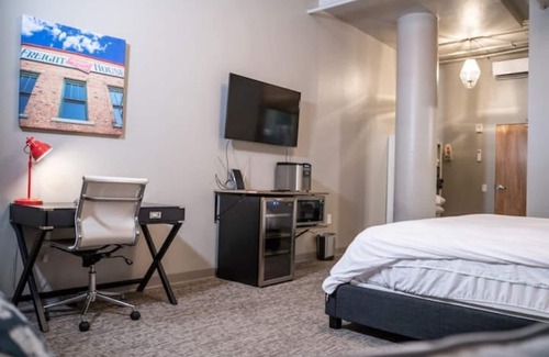 Located in Davenport, this modern suite with King bed + Full Sleeper Sofa boasts amenities such as a fitness center, game room, theater room, courtyard with a grill, rooftop deck, smart TV, and WiFi! Located near the city’s best breweries, coffee shops, restaurants, Palmer College, St. Ambrose University, The Village of East Davenport, Modern Woodman Park, The Adler Theater, Figge Art Museum, and Vander Veer Botanical Park, come see what Downtown Davenport has to offer!