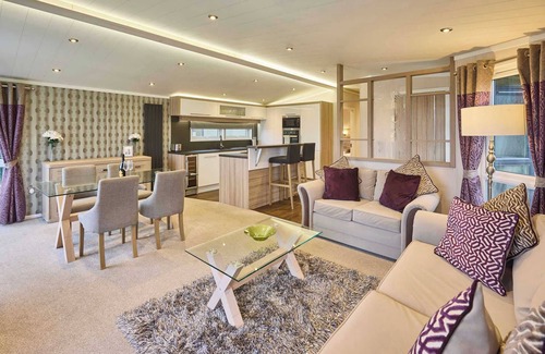 The open plan living space is perfect for unwinding and socialising. During the day, natural light floods the space from the floor to ceiling windows creating a bright and airy look. On an evening, retreat to one of the comfy sofas and turn on the flat screen TV to keep up with your favourite shows. On colder nights, turn on the electric fire for a cosy feel.