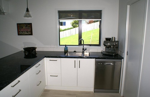 Estuary Views is a large family bach located on the outskirts of Whangamata. With five bedrooms spread over two levels and three bathrooms, there is plenty of room for extended family or a group of friends to relax. The home is pet-friendly, so the whole family can enjoy time away. The four bedrooms upstairs consist of one California king bed, one king bed, three single beds, and a queen bed, comfortably sleeping up to 11 people in both areas, 9 upstairs and 2 in the studio, which has a king bed.