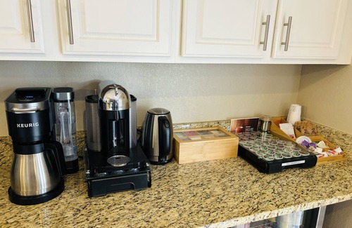 The family room has a TV and large sectional sofa. The open floorplan then features the gourmet kitchen with stainless steel applianeces and fully equipped with all of the items you might need to cook or bake. There is a coffee/tea bar with Keurig K-Duo Plus coffee maker allowing you to make a cup or use the thermal carafe to make a pot of coffee. A Nepresso Vertuo and electric kettle are also provided. Exit the kitchen to the sunny deck overlooking the lush yard great for lounging, enjoying meals and relaxing.