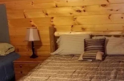 Three flat screen TV's (55" in living room, one 50" TV' in the game room and a 42" TV in the master bedroom). 10x26 front deck with hot tub jacuzzi and 8x48 covered porch. Enjoy the 8 foot US made slate Cherry Oak Pool Table, Solid Walnut Oak Poker Table, brand new Cherry Oak 12 Ft. Shuffleboard Table with bowling pins, and Hot Tub on the deck which is emptied and cleaned after every stay! Enjoy a glass of wine at the fire pit. Cabin sits on a 'private' acre. Bring your bicycle or hiking shoes.