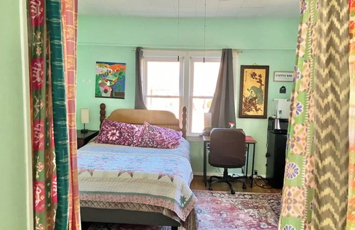 Enjoy a fully private studio featuring a comfy queen bed with plush linens, blackout curtains and an overhead fan. You have your own private bathroom and private entrance with 24/7 keypad entry.