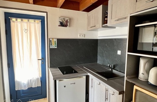 Ground floor: living room (convertible sofa), kitchenette (fridge, mini-oven, microwave, ceramic hob), WC.