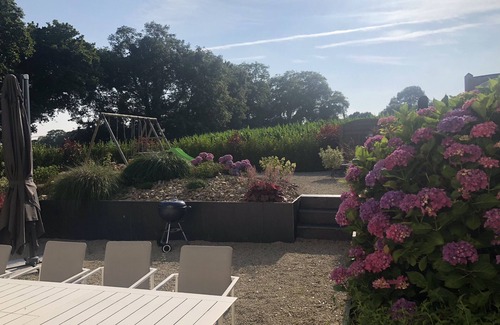 Neat decoration on the theme of travel promoting escape and relaxation: large living room with granite fireplace equipped with a wood stove, dining room with large farm table with 10 seats, 4 themed bedrooms (Ile de Brehat, Sillon de Talbert, Trieux Estuary, Georges Brassens Beach), 2 modern bathrooms, 3 WCs, ultra-equipped kitchen with 4 bar counter seats, BBQ, terrace and landscaped garden with views of the surrounding countryside.