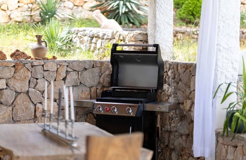 This charming holiday home with pool is located on a secluded hill in the center of Hvar, between the villages of Zastražišće and Gdinj. The panoramic views of the sea, the neighboring island and the mountain massif are simply breathtaking. Olive trees and fragrant plants grow on the spacious property. Each of the 3 bedrooms has its own bathroom. There is also a living room with a kitchen. Bedrooms #1 and #2 have an outside entrance and bedroom #3 is integrated into the living room but separated by a curtain. Rooms 1 and 3 have air conditioning and TV, while room 2 has an ideal temperature in summer and entertaining evenings on summer nights without TV. The covered terrace in front of the living room offers a beautiful view of the sea. The outdoor pool offers refreshing and fun swimming with a large sun terrace. Fitness equipment is also available (stepper and bike, weights, yoga mat). The indoor and outdoor cooler and the ice machine will take care of your cold drinks and fruits. At the back of the house is the entrance to the wine cellar where you can buy wines. Also, there is the occasional butterfly, ladybug, bee fly, mosquito or small caterpillar or gecko. Just allow yourself to blend in with nature and enjoy a piece of paradise.The numerous bays on the south and north side of the village of Gdinj offer additional refreshments and days on the beach, here you can experience the beaches of Shrov Dolac and Skozonja.