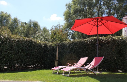 - Large wooden deck, pergola, barbecue, garden furniture, sun loungers, parasol.