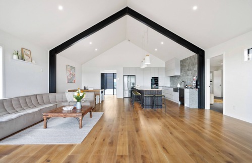 Wake up to the soft light of morning pouring through wide windows, with mist rising gently off the water beyond the hills. The kids are already padding around the house barefoot, chasing the smell of breakfast drifting from the open-plan kitchen. You wander out with a cup of coffee to the expansive deck, where birdsong fills the air and the view stretches out across rolling pasture to the glinting water below.