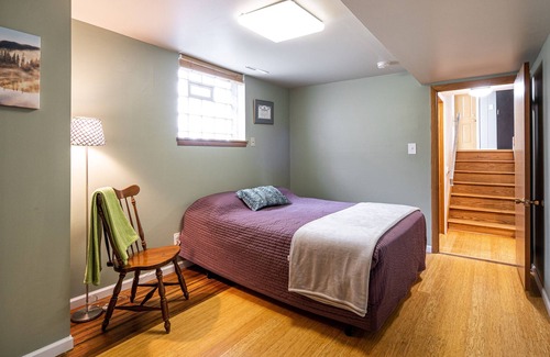 Our finished basement is divided into 5 spaces, a private bedroom with a queen bed, a large TV room with fire place and reclining leather sofas, a playroom with padded carpets and plenty of toys, laundry room with large washer and dryer and a bathroom featuring a large bath tub.