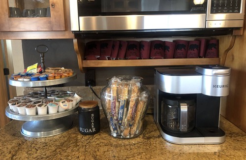 2 Keurig coffee maker with assorted pods (initial supply included) and full pot options. Creamer, sugar and biscotti supplied.