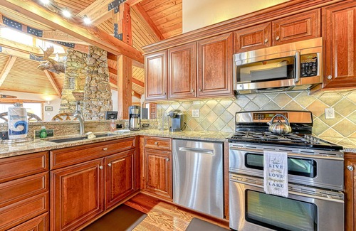 Everyone will love the huge main living space, highlighted by the soaring, pentagon-shaped wooden ceiling and enormous stone fireplace. There are lots of cozy spots to gather, as well as a wall-mounted flatscreen positioned just right in front of two buttery leather couches, perfect for unwinding at the end of the day. Elsewhere on the main floor, you’ll find an updated, modern kitchen, with a full suite of stainless steel appliances, including a double oven, and all the gadgets the chef will need to whip up a feast. When it’s time to eat, the group can convene at two separate tables, one seating six and one seating four. Just off the dining room/library, you’ll find a screened-in porch with lots of seating and a lake view, perfect for morning coffee or a sundowner.
