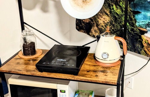Coffee and tea are readily available along with mini fridge w/freezer, toaster, and microwave. There is no full kitchen but we have added a hot plate and basic cookware. There are also some great little restaurants not too far away.