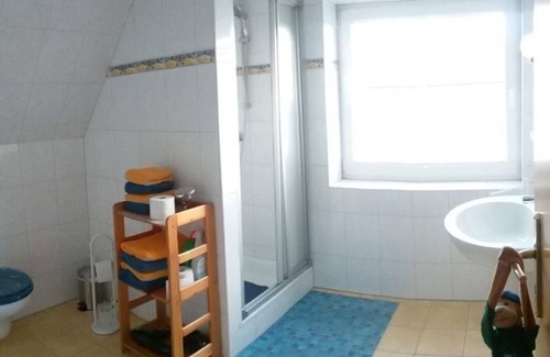 Holiday house half, about 80 square meters, 1 -5 people, all bedrooms with blackout blinds, WLANGround floor: spacious and bright living room with corner (sleep) sofa, flat screen DVD player, stereo, telephone, large dining area and terrace exit Kitchen with dishwasher, microwave and Freezer, fully equipped, dining area guest toilet utility room with washing machine Upstairs: bedroom with double bed bedroom with franz. Bed large bathroom with shower and bath terrace bread service