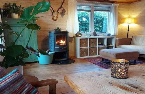 Wooden cabin with 3 bedrooms (1 master bedroom with a family bed (3x80), 1 room with a double bed (1.20 m), 1 room with a double bed (1.40 m). Naturally decorated with several shamanic, esoteric, and nature-themed details, fellow witches will immediately feel at home. The cabin is heated by a wood-burning stove or a kerosene heater. It certainly has modern conveniences like a dishwasher, Wi-Fi, and Bluetooth speakers, but there is no TV. We think that's part of the magic: We hope our home will be a place of true connection for our guests—connection to themselves, to each other, to nature. The garden is fenced, but not well enough for small dogs, who tend to stray. There is a shared field with several trampolines, a picnic bench, and a fire pit, which you are welcome to use.